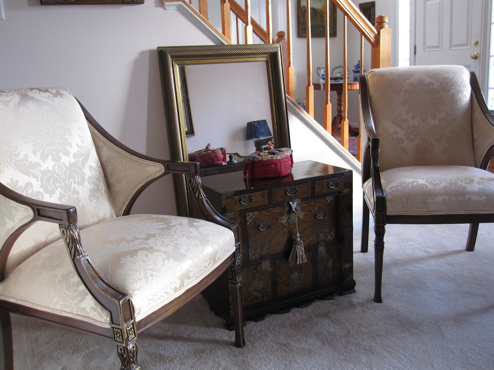 The chair belonged to my great, great-grandmother in England and tumbled on down to me. I am not a fan of Victorian furniture but this is one of those things I could not part with for sentimental reasons. The upholstery fabric works nicely with the wall color, SW Wondrous blue.